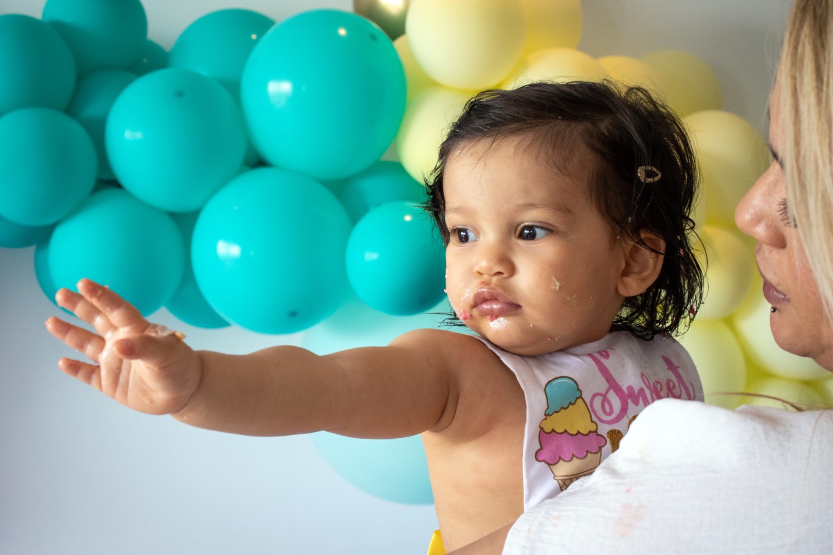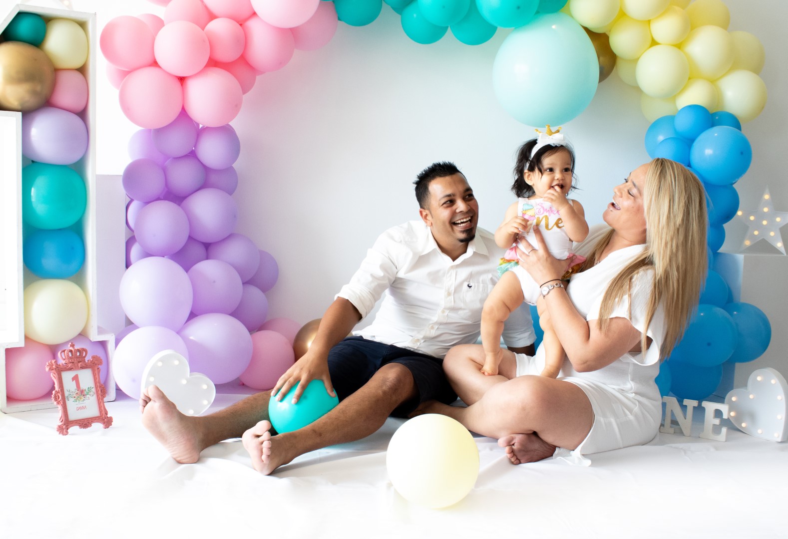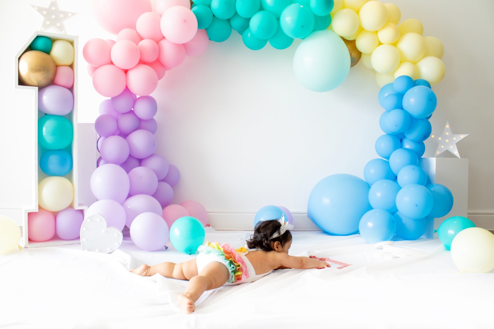 Meet the Beautiful 1 year old Gianna, She had her cake smash set up for her with colorful balloons and a stunning rainbow cake.